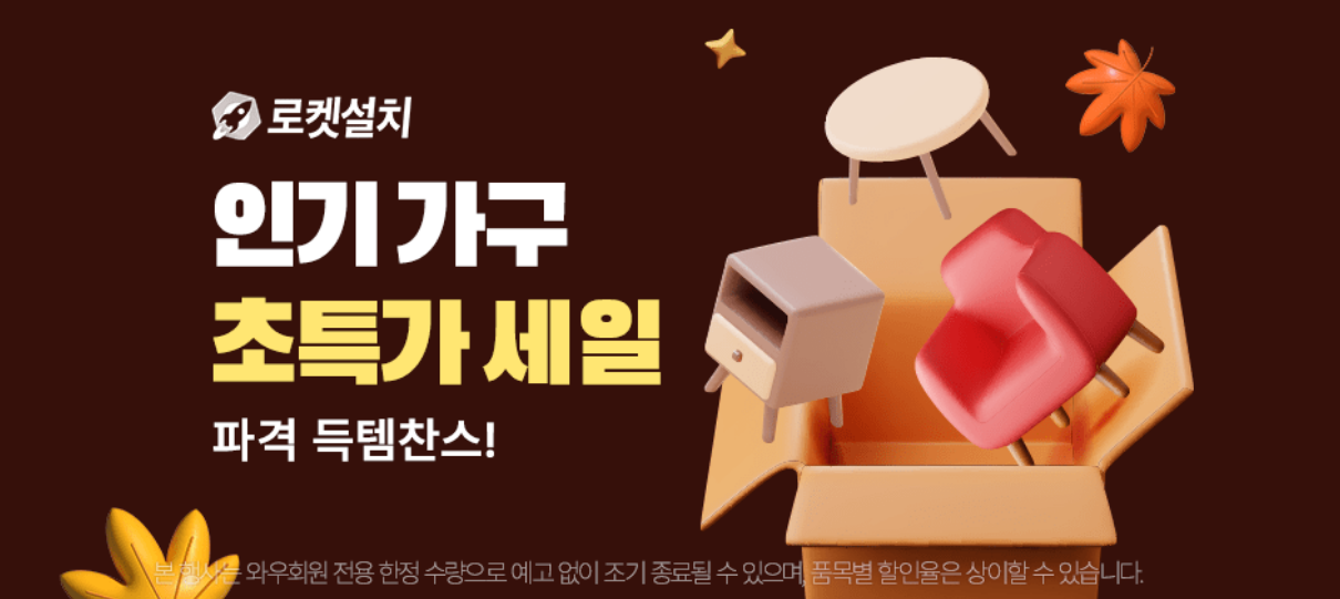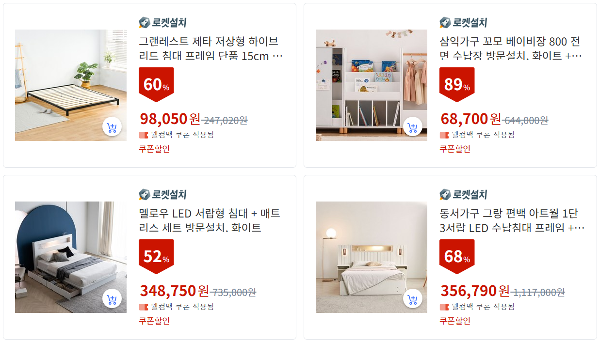 또한 ‘로켓설치’ 서비스가 가능한 인기 가구 상품들을 대상으로 일주일간 최대 25% 할인 행사를 진행한 바 있으며, 최근에는 최대 50%까지 할인되는 기획전도 열렸다.
